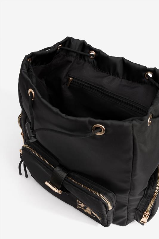 Mochila negra con cierres dorados.