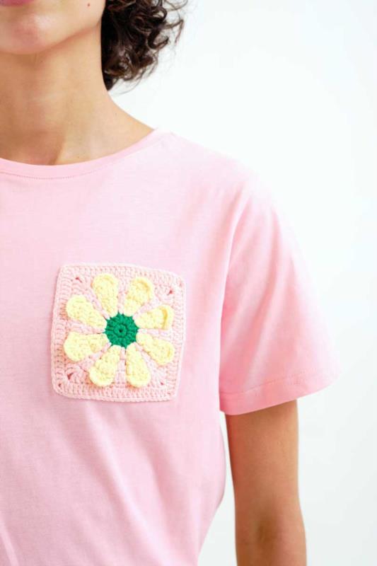 Camiseta de manga corta con girasol bordado en crochet.