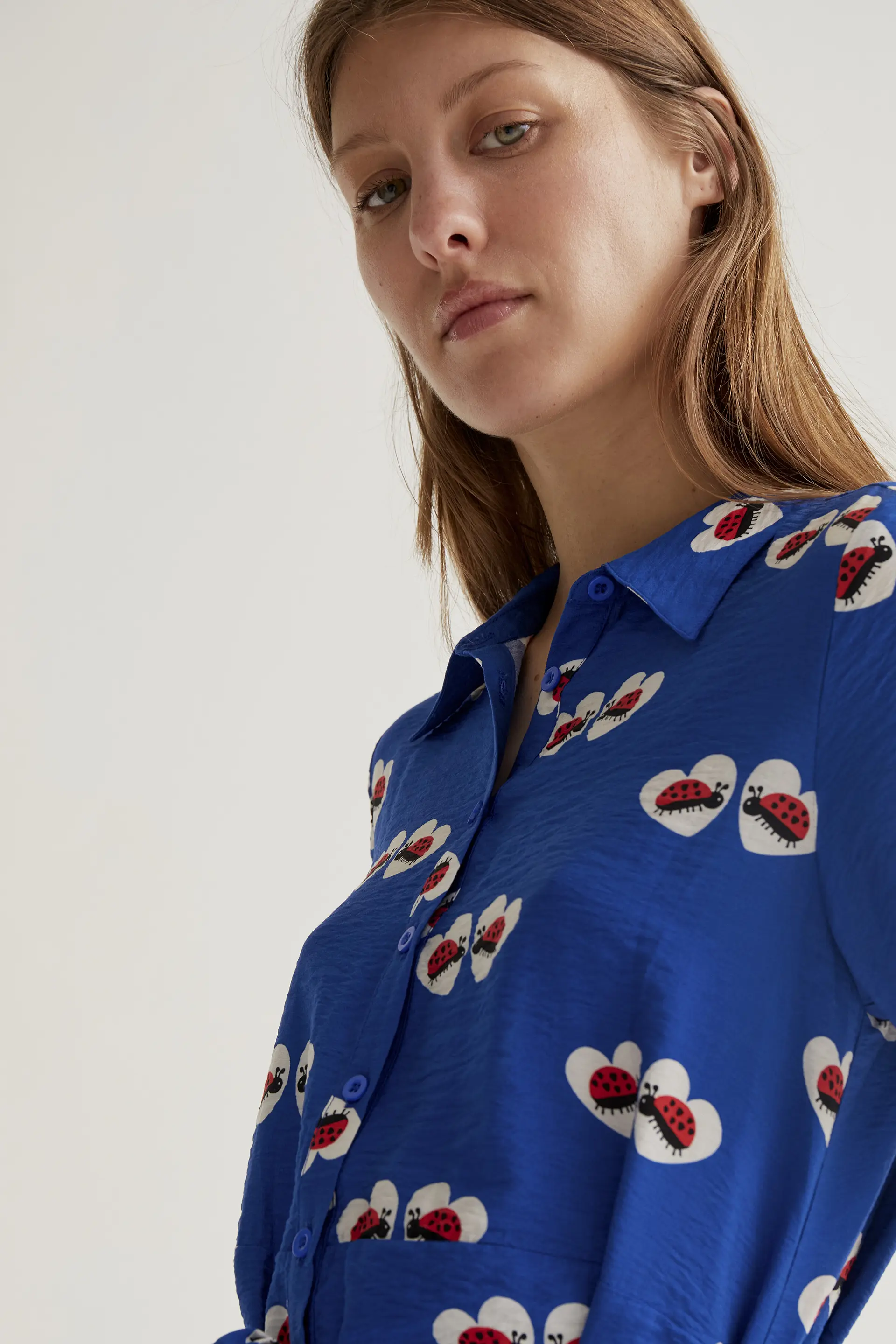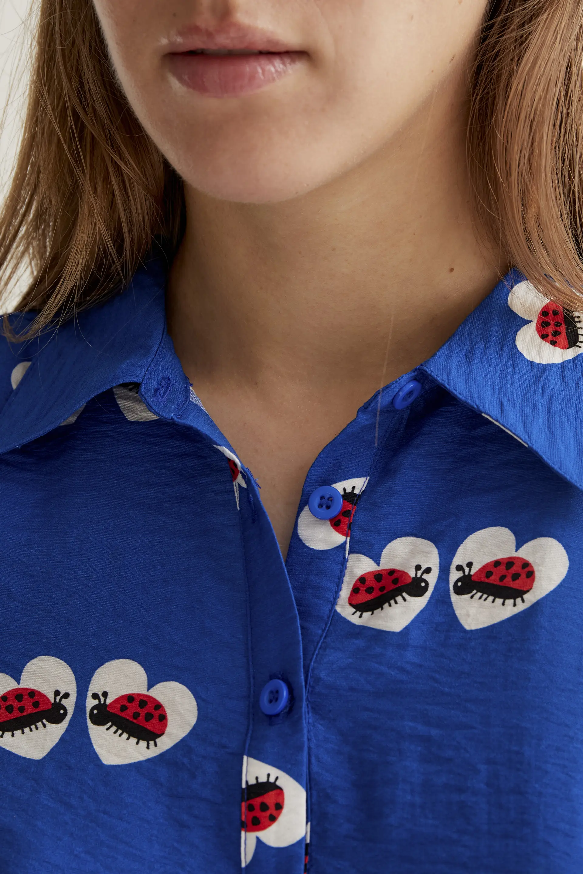 Vestido camisero de fondo azul y original estampado de mariquitas.